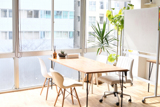 ホワイトボードもあり、大きな窓で開放的な雰囲気の部屋です。